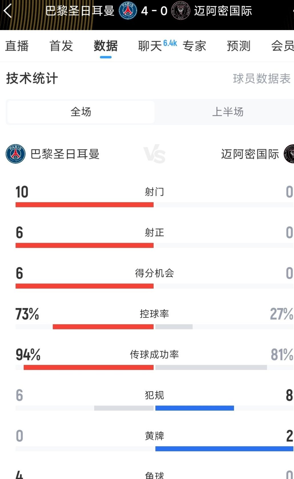 06月30日訊 世俱杯1/8決賽,巴黎圣日耳曼vs邁阿密國(guó)際。上半場(chǎng)比賽結(jié)束,巴黎4-0領(lǐng)先邁阿密。半場(chǎng)數(shù)據(jù)如圖所示。