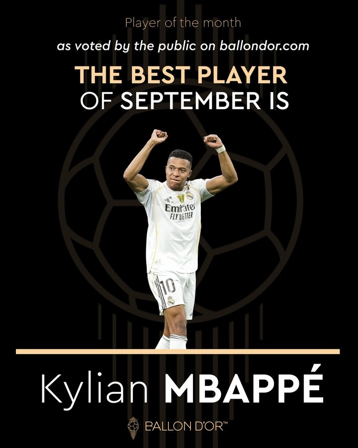 金球獎官方消息,姆巴佩當(dāng)選金球獎9月份最佳球員。