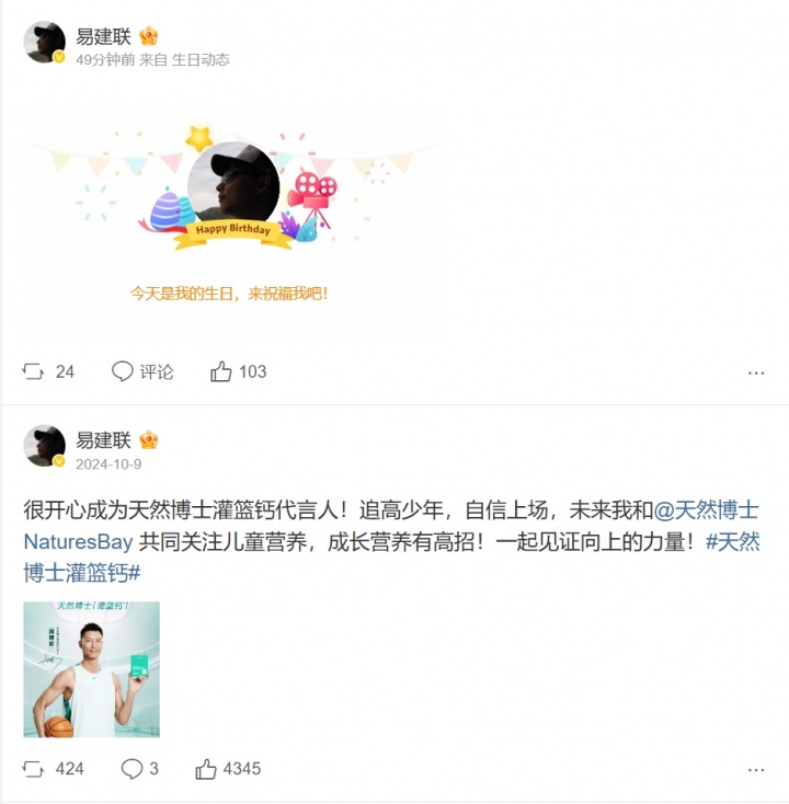 10月27日訊 易建聯(lián)個(gè)人社媒今日更新了一則生日動(dòng)態(tài)。這是易建聯(lián)個(gè)人微博社媒關(guān)于生日的自動(dòng)動(dòng)態(tài)。
