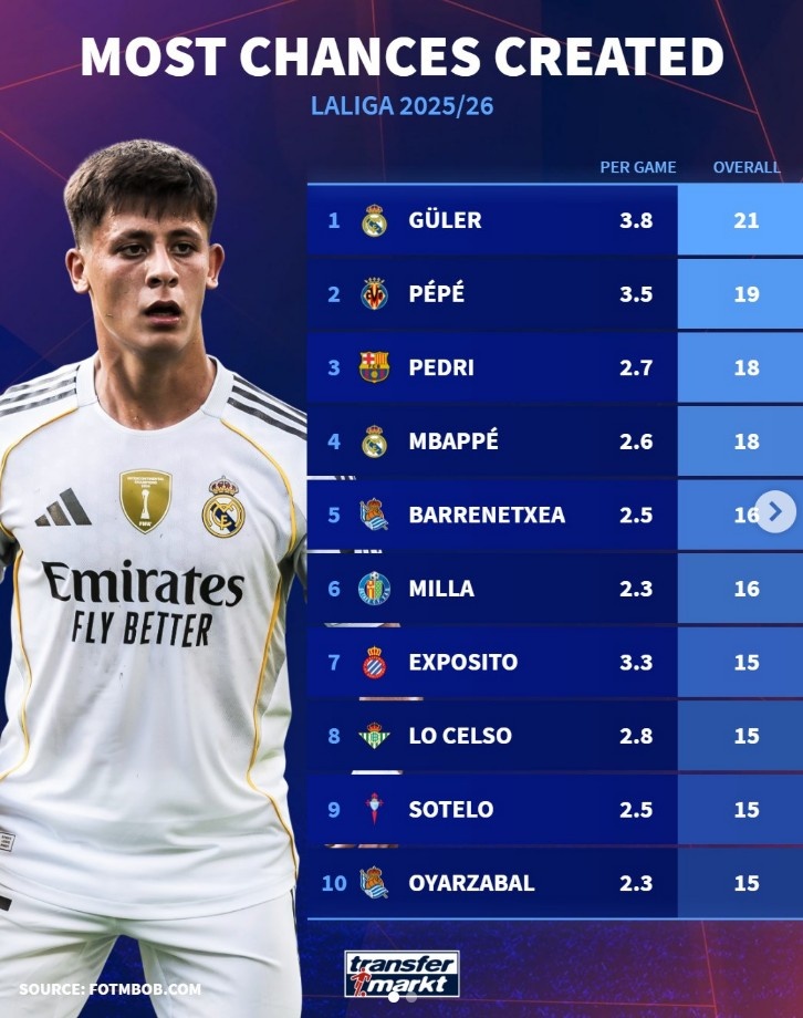 9月30日訊 德轉(zhuǎn)盤點了本賽季西甲創(chuàng)造機(jī)會榜單,其中居勒爾共計21次創(chuàng)造機(jī)會居首,具體如下(場均數(shù)據(jù)+總數(shù)據(jù)):