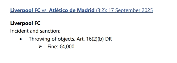 10月01日訊 歐冠首輪比賽,利物浦3-2戰(zhàn)勝馬競(jìng)。本場(chǎng)比賽中,利物浦因?yàn)榍蛎酝稊S物品,違反《歐足聯(lián)紀(jì)律準(zhǔn)則》第16(2)(b)條,俱樂(lè)部被罰款4000歐元。