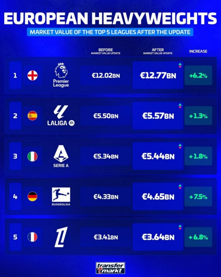 10月20日訊 德轉(zhuǎn)此前更新了足壇球員身價,并盤點了五大聯(lián)賽球隊總身價榜,其中英超遙遙領(lǐng)先,以下為具體情況:1、英超 127.7億歐,上漲6.2%2、西甲 55.7億歐,上漲1.3%3、意甲 54.4億歐,上漲1.8%4、德甲 46.5億歐,上漲7.5%5、法甲 36.4億歐,上漲6.8%